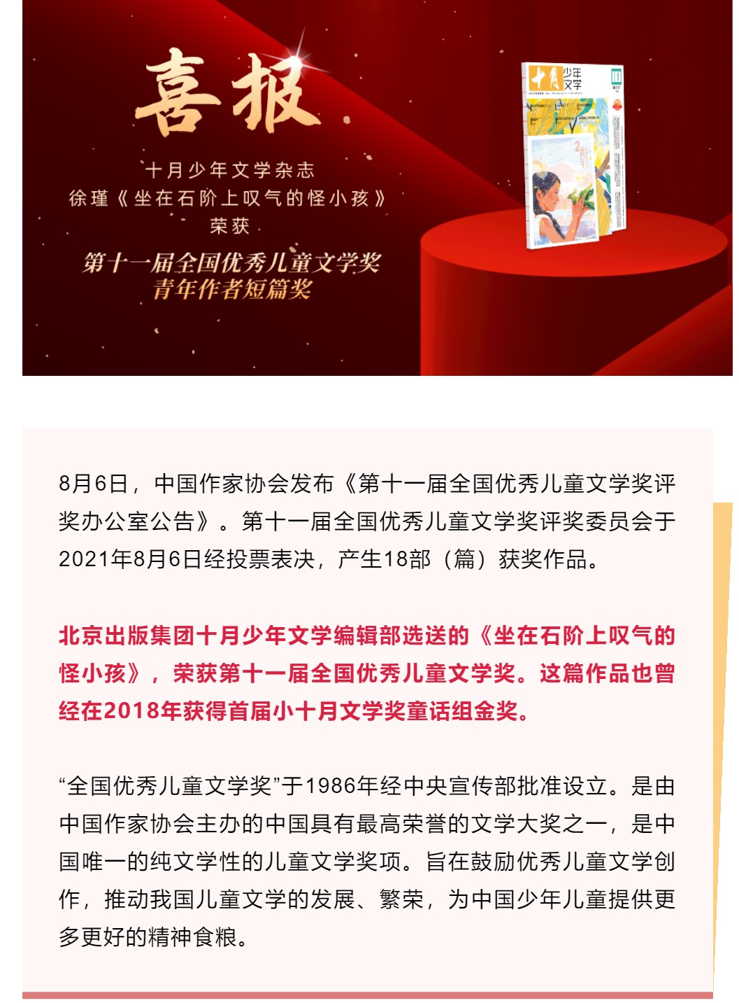 重磅 | 十月少年文学编辑部选送《坐在石阶上叹气的怪小孩》荣获第十一届全国优秀儿童文学奖