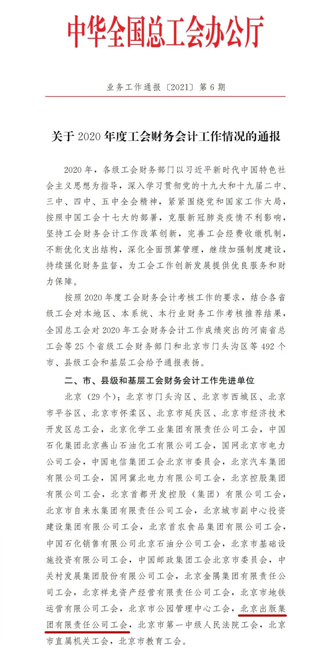 日前,在中华全国总工会办公厅印发的《关于2020年度工会财务会计工作情况的通报》中,北京出版集团工会被中华全国总工会授予2020年度市级工会财务工作先进单位称号。这是集团工会自2016年获此称号以来,第二次获此殊荣。据悉,本次北京市共有29家单位获此称号。
