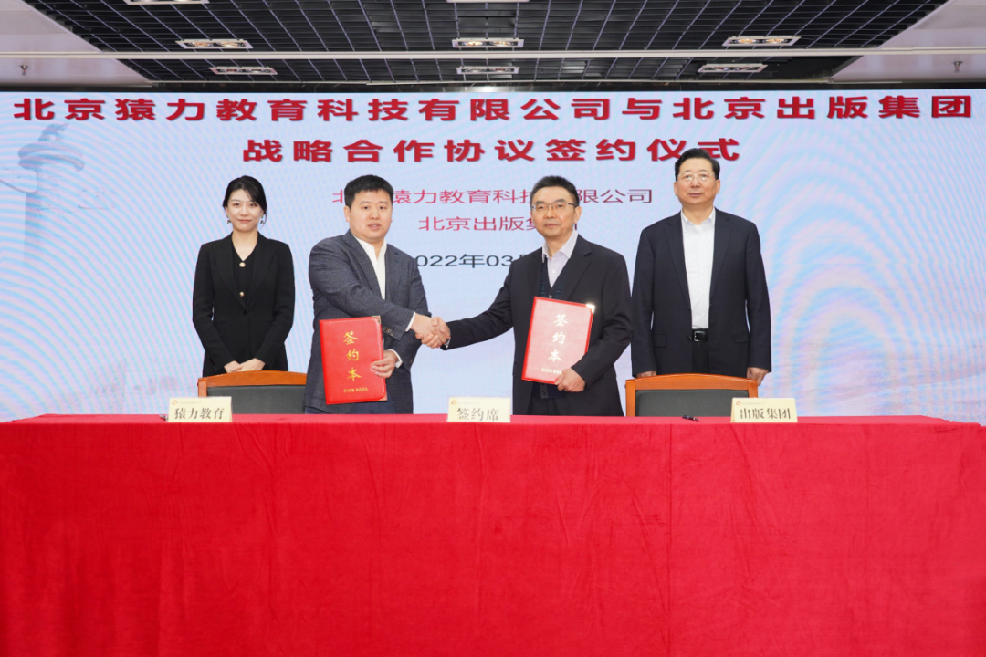 3月24日,北京出版集团与北京猿力教育科技有限公司战略合作协议签约仪式在集团12层多功能厅举行。北京猿力教育科技有限公司集团总裁李鑫,北京出版集团党委书记、董事长康伟,集团党委副书记、总经理吴文学出席。会议由北京出版集团党委委员、董事、总编辑李清霞主持。
